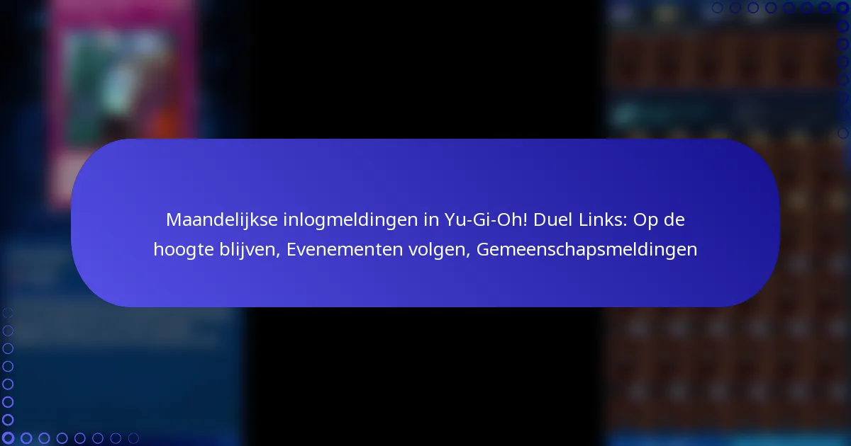 Maandelijkse inlogmeldingen in Yu-Gi-Oh! Duel Links zijn waarschuwingen die spelers informeren over aankomende evenementen, updates uit de gemeenschap en beloningen voor het inloggen in het spel. Deze meldingen helpen spelers betrokken en geïnformeerd te blijven over ontwikkelingen in het spel en speciale promoties.